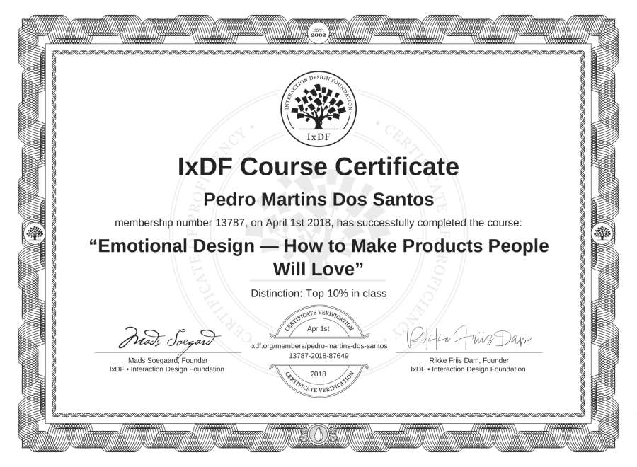 Pedro Martins Dos Santos's IxDF Course Certificate: Emotional Design — How to Make Products People Will Love