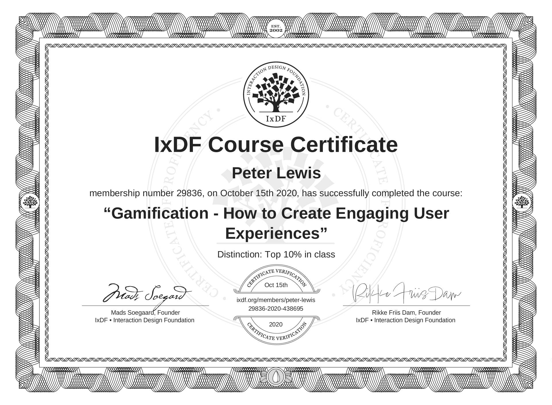 Peter Lewis's IxDF Course Certificate: Gamification - How to Create Engaging User Experiences