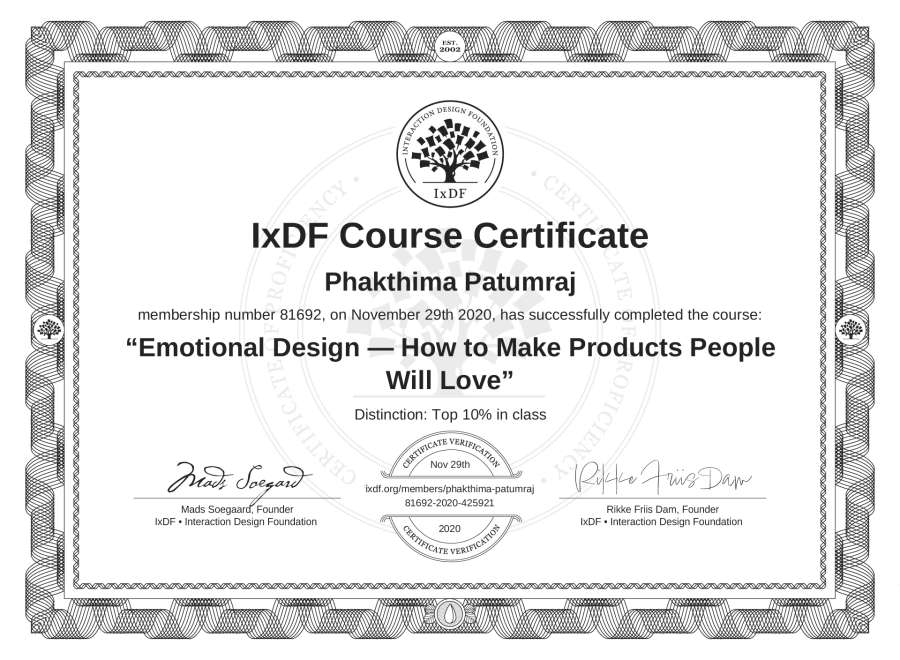 Phakthima Patumraj's IxDF Course Certificate: Emotional Design — How to Make Products People Will Love
