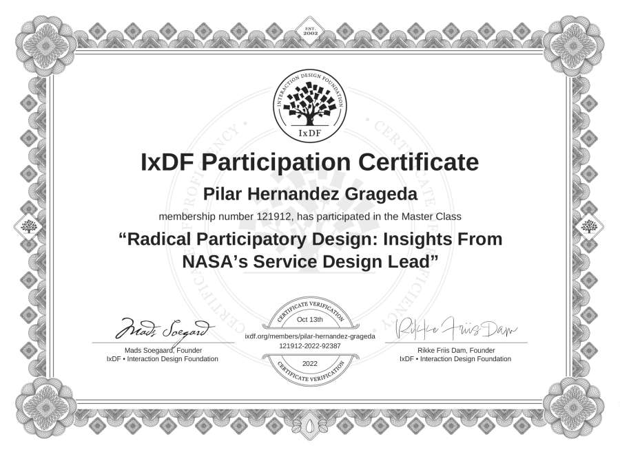 Pilar Hernández Grageda's IxDF Masterclass Certificate: Radical Participatory Design: Insights From NASA’s Service Design Lead