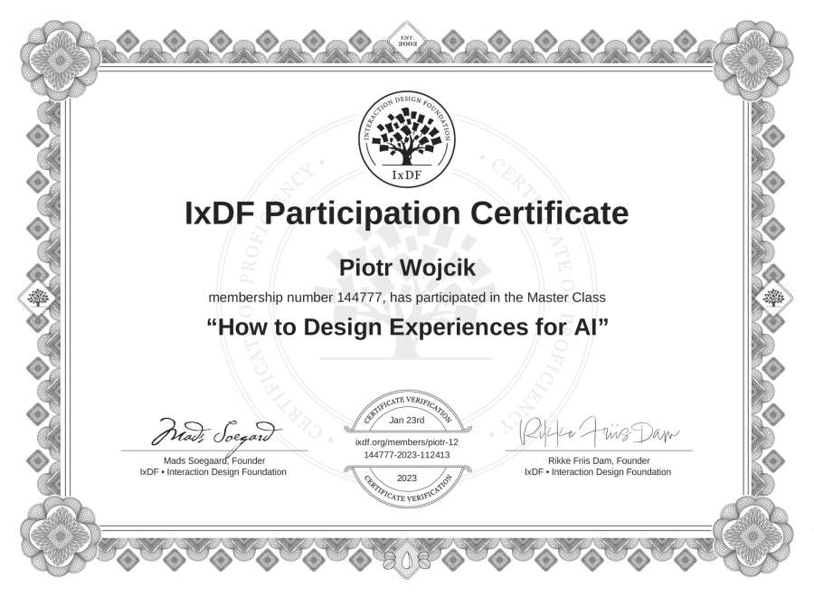 Piotr Wójcik's IxDF Masterclass Certificate: How to Design Experiences for AI