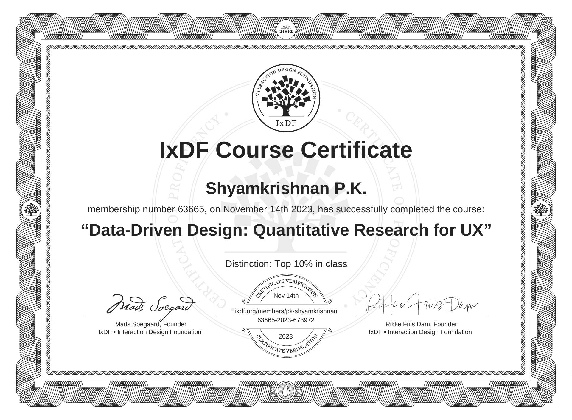 The IxDF Course Certificate above is awarded to Shyamkrishnan P.K. with a Top 10% Distinction in formal recognition of their coursework surpassing the rigorous benchmarks of exceptional performance established by the IxDF Educational Codex.