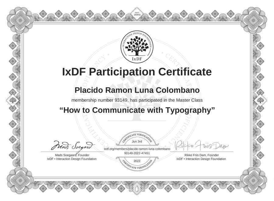 Plácido Ramón Luna Colombano's IxDF Masterclass Certificate: How to Communicate with Typography