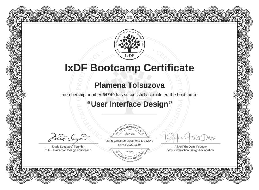 Plamena Tolsuzova's Bootcamp Certificate: User Interface Design