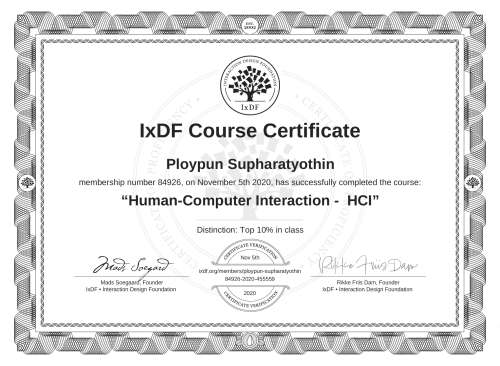 IxDF Course Certificates are awarded to Ploypun Supharatyothin in formal recognition of their coursework surpassing the rigorous benchmarks of exceptional performance established by the IxDF Educational Codex.