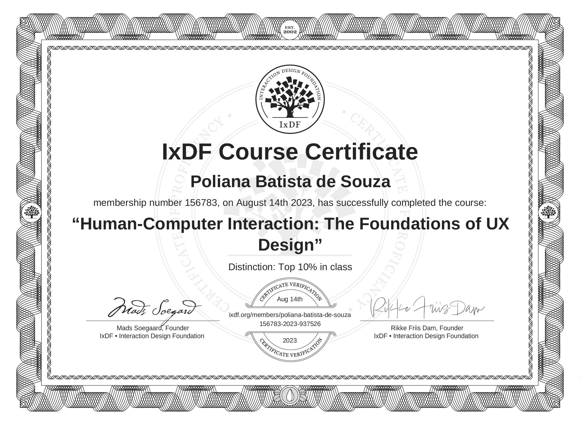 Poliana Batista de Souza's IxDF Course Certificate: Human-Computer Interaction: The Foundations of UX Design