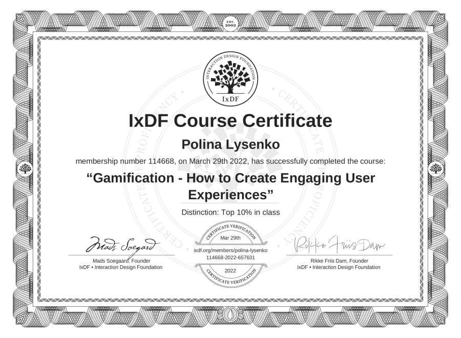 Polina Lysenko's IxDF Course Certificate: Gamification - How to Create Engaging User Experiences