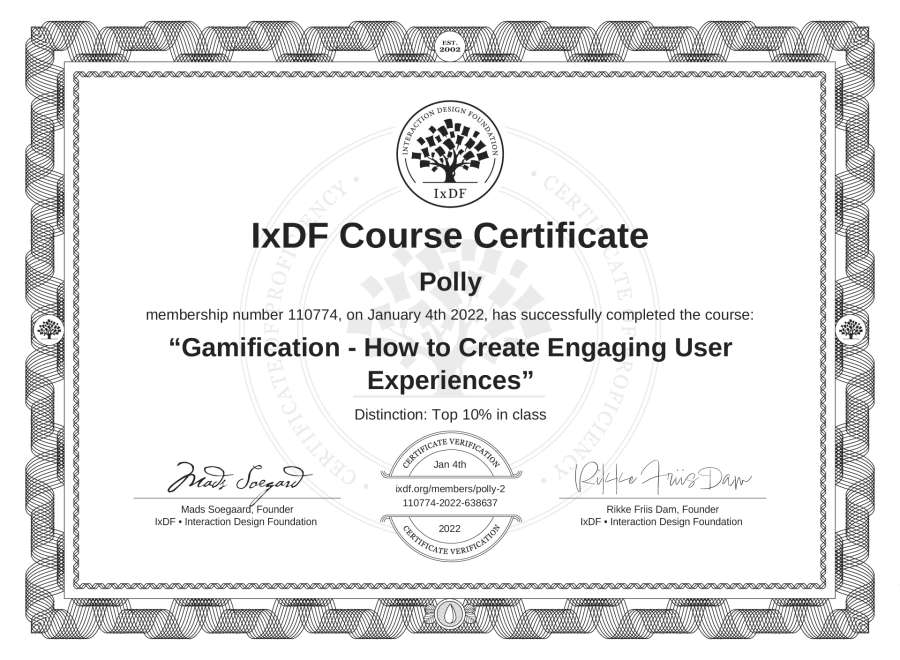 Polly's IxDF Course Certificate: Gamification - How to Create Engaging User Experiences
