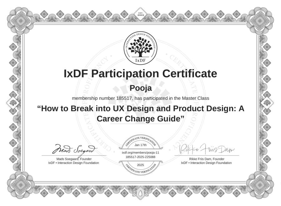 Pooja's IxDF Masterclass Certificate: How to Break into UX Design and Product Design: A Career Change Guide