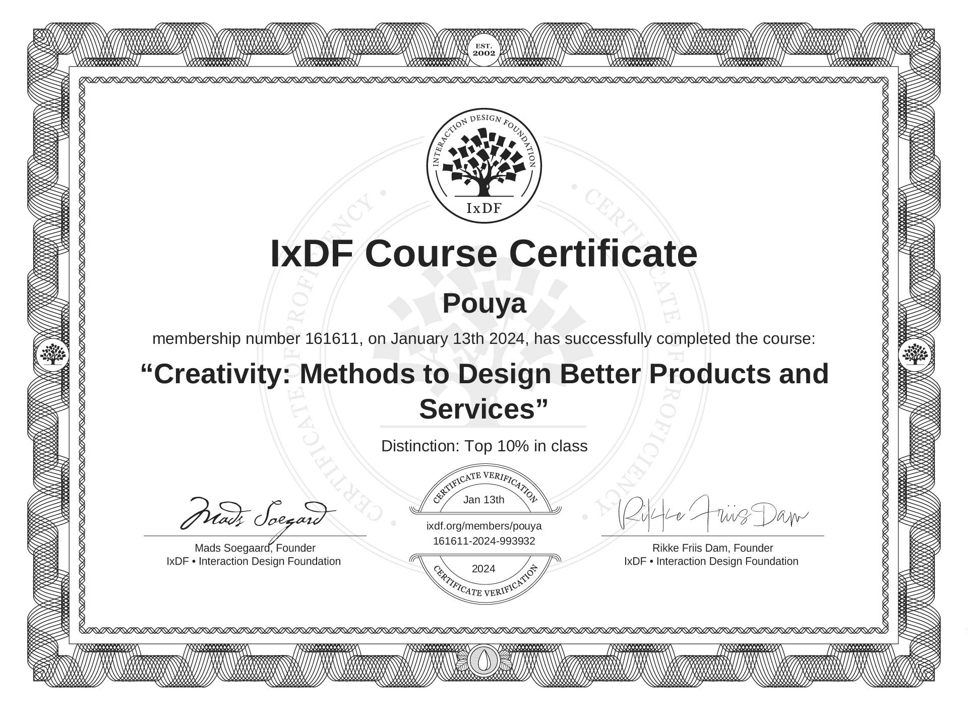 Pouya's IxDF Course Certificate: Creativity: Methods to Design Better Products and Services
