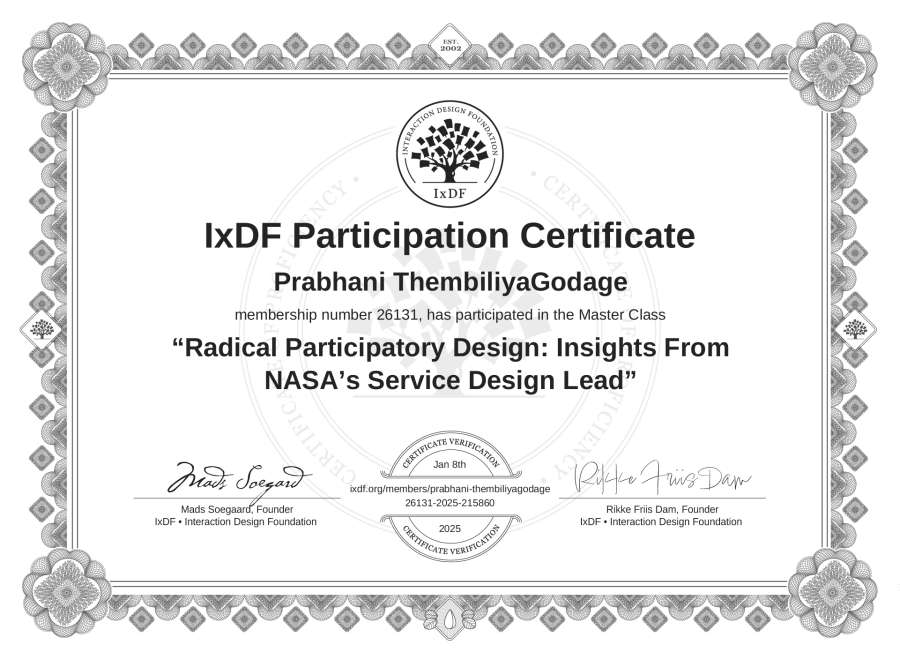 Prabhani ThembiliyaGodage's IxDF Masterclass Certificate: Radical Participatory Design: Insights From NASA’s Service Design Lead
