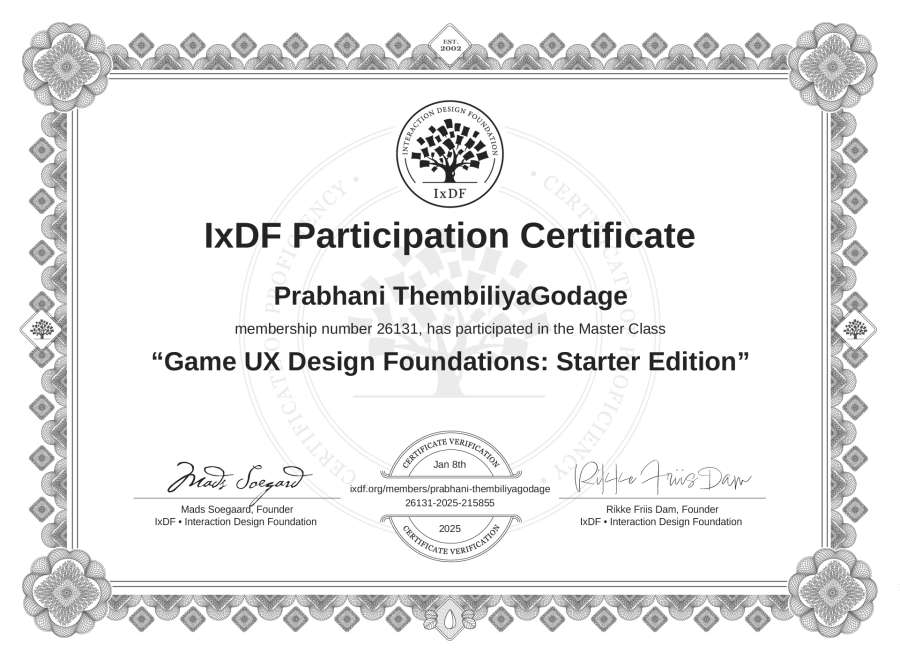 Prabhani ThembiliyaGodage's IxDF Masterclass Certificate: Game UX Design Foundations: Starter Edition