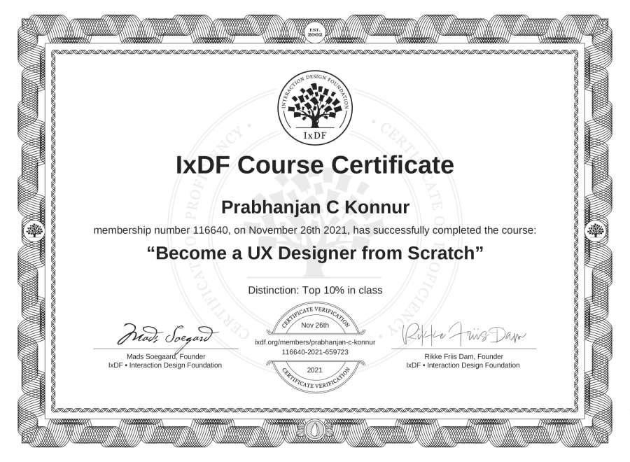 Prabhanjan C Konnur's IxDF Course Certificate: Become a UX Designer from Scratch