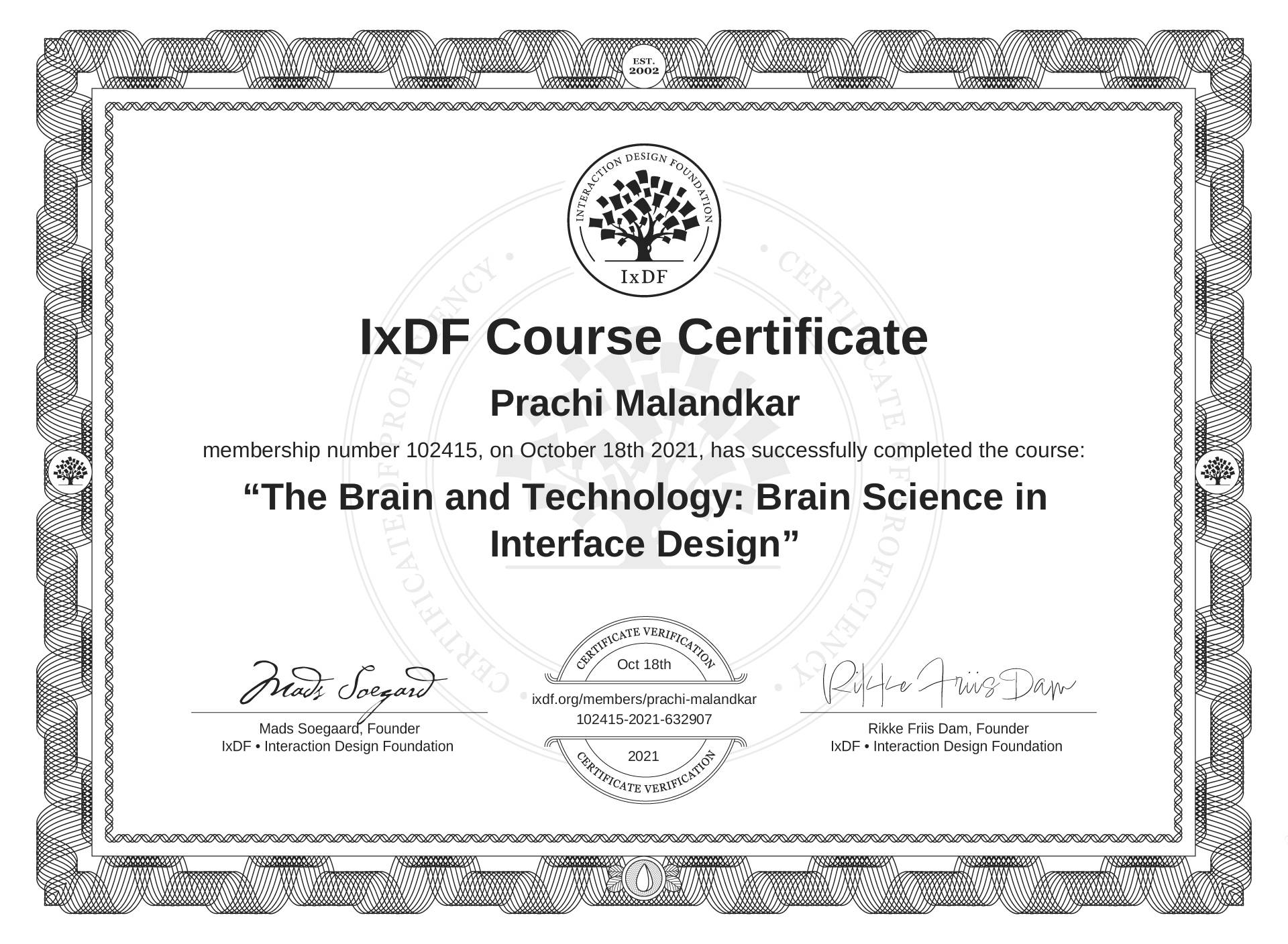 Prachi Malandkar's IxDF Course Certificate: The Brain and Technology: Brain Science in Interface Design