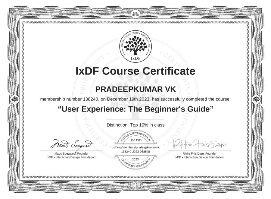 PRADEEPKUMAR VK's IxDF Course Certificate: User Experience: The Beginner's Guide