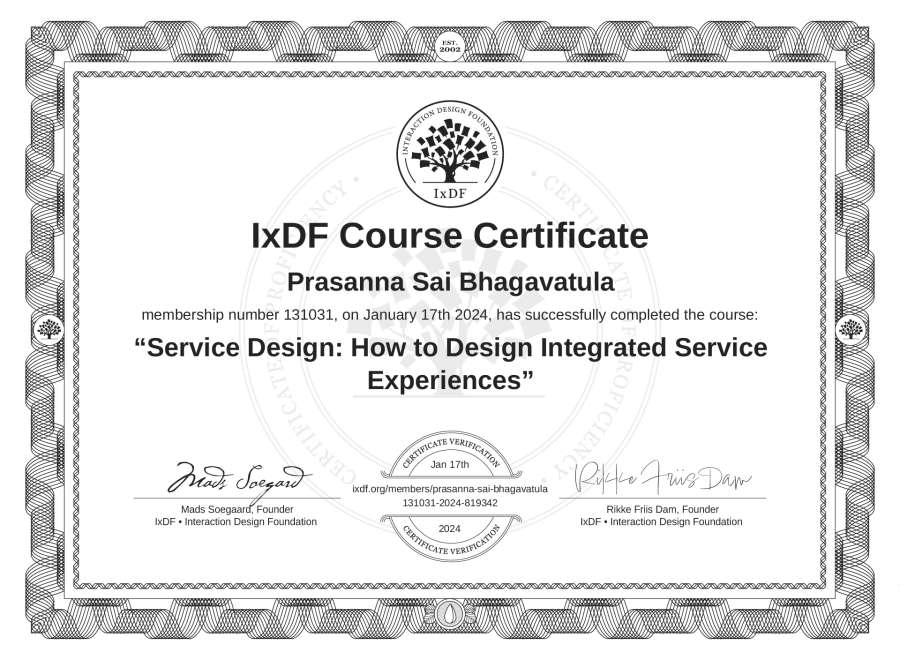 Prasanna Sai Bhagavatula's IxDF Course Certificate: Service Design: How to Design Integrated Service Experiences
