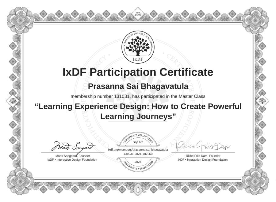 Prasanna Sai Bhagavatula's IxDF Masterclass Certificate: Learning Experience Design: How to Create Powerful Learning Journeys