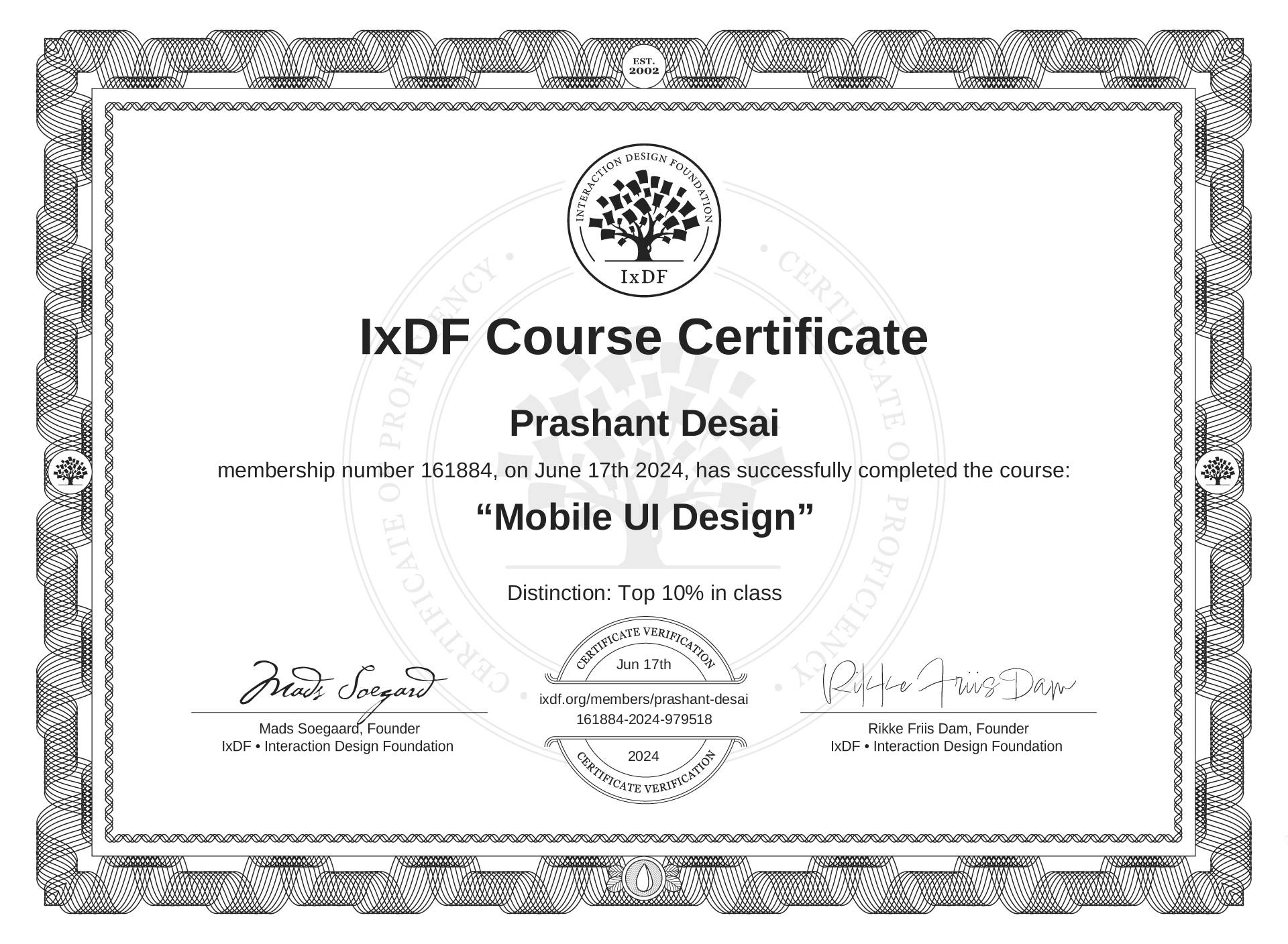 The IxDF Course Certificate above is awarded to Prashant Desai with a Top 10% Distinction in formal recognition of their coursework surpassing the rigorous benchmarks of exceptional performance established by the IxDF Educational Codex.