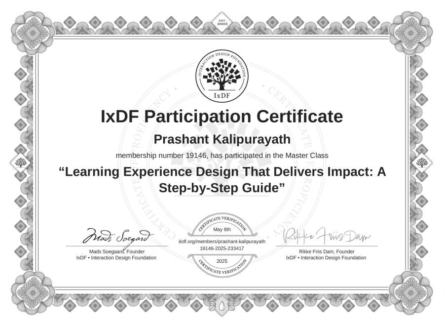 Prashant Kalipurayath's IxDF Masterclass Certificate: Learning Experience Design That Delivers Impact: A Step-by-Step Guide