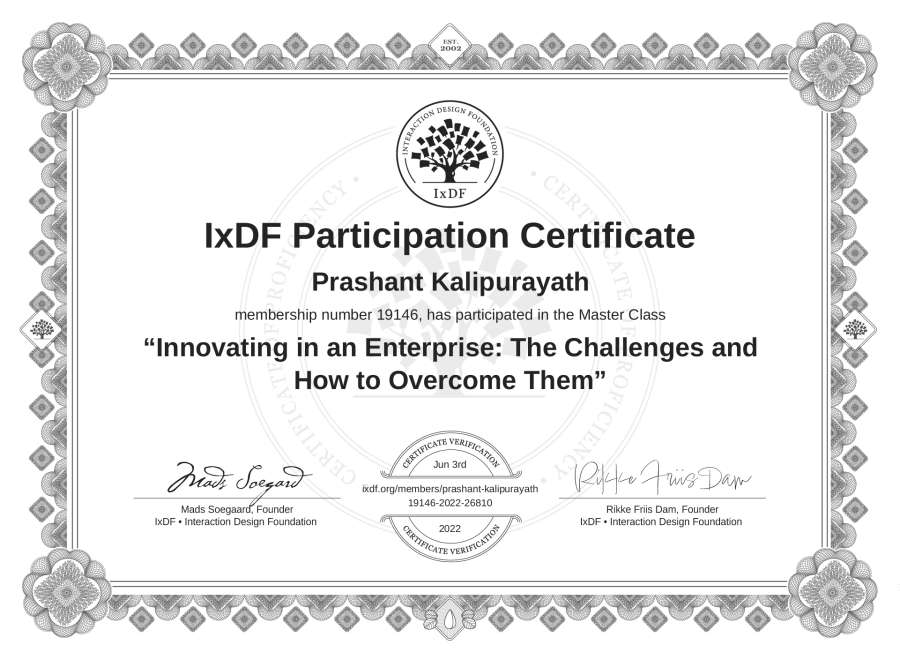 Prashant Kalipurayath's IxDF Masterclass Certificate: Innovating in an Enterprise: The Challenges and How to Overcome Them