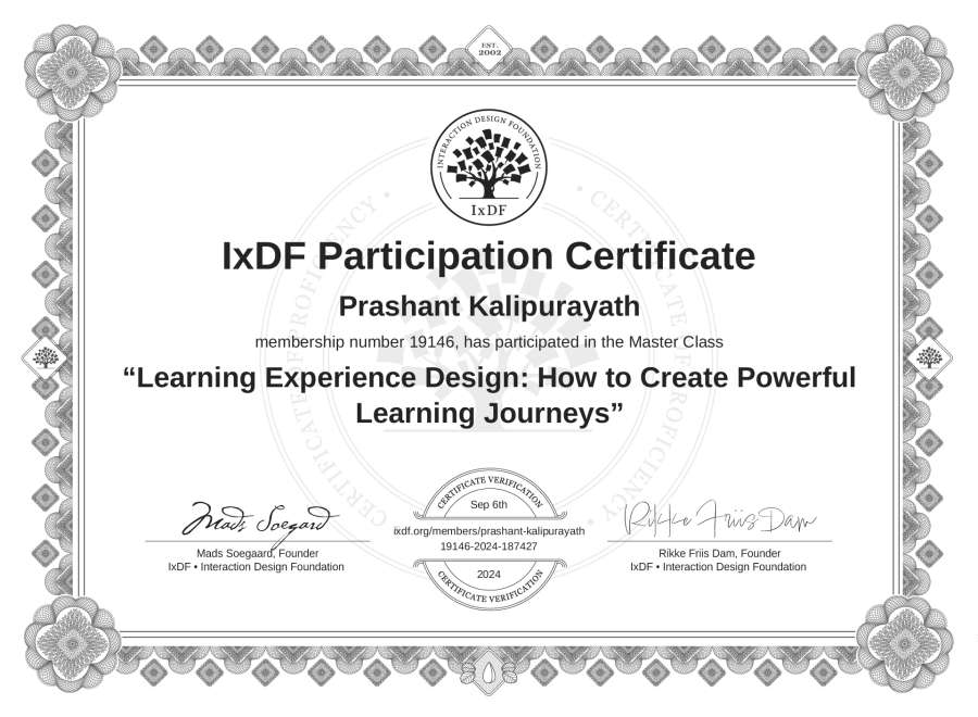 Prashant Kalipurayath's IxDF Masterclass Certificate: Learning Experience Design: How to Create Powerful Learning Journeys