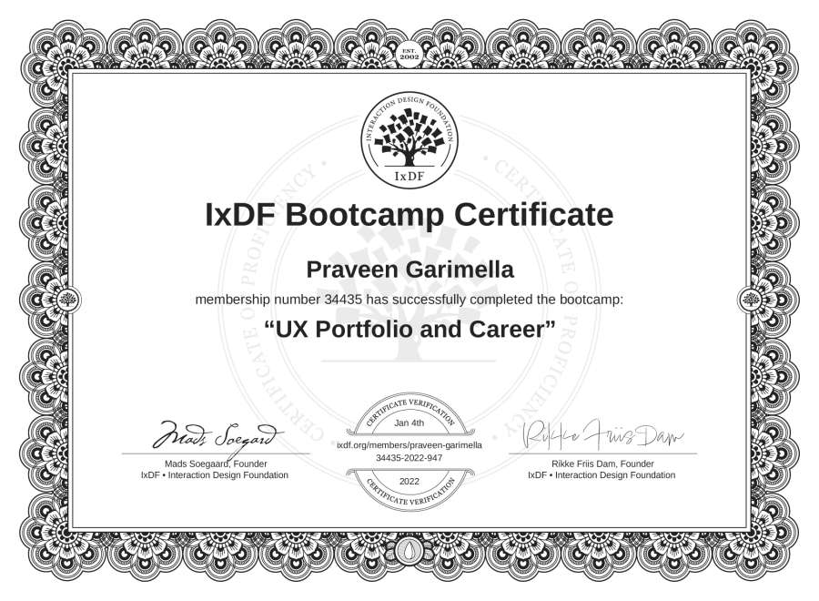 Praveen Garimella's Bootcamp Certificate: UX Portfolio and Career