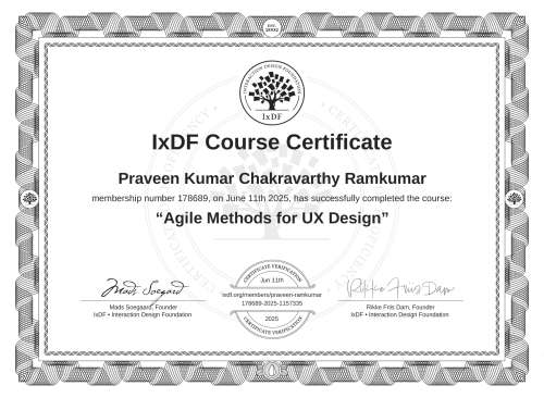 IxDF Course Certificates are awarded to Praveen Kumar Chakravarthy Ramkumar in formal recognition of their coursework surpassing the rigorous benchmarks of exceptional performance established by the IxDF Educational Codex.