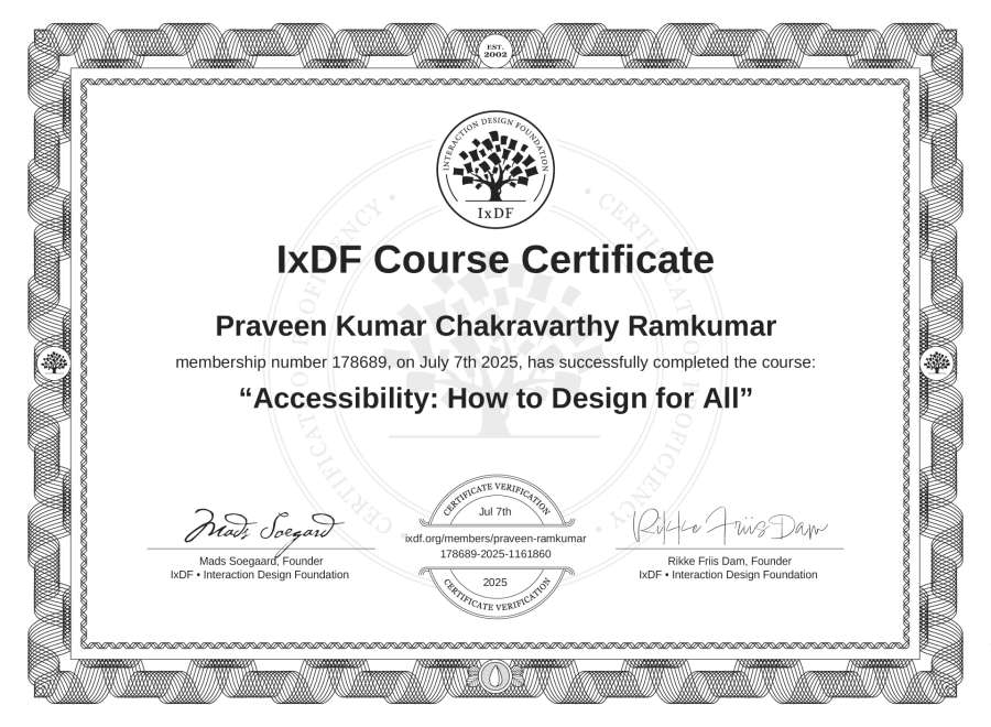 Praveen Kumar Chakravarthy Ramkumar's IxDF Course Certificate: Accessibility: How to Design for All
