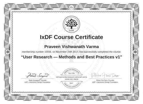 IxDF Course Certificates are awarded to Praveen Vishwanath Varma in formal recognition of their coursework surpassing the rigorous benchmarks of exceptional performance established by the IxDF Educational Codex.