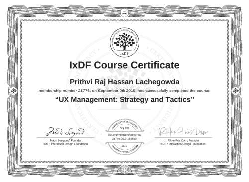 This IxDF Membership Certificate is issued to Prithvi Raj Hassan Lachegowda in formal recognition of their membership of the IxDF, global leader in design education.