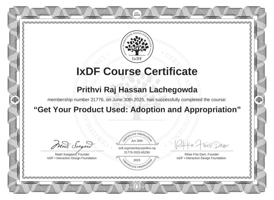 Prithvi Raj Hassan Lachegowda's IxDF Course Certificate: Get Your Product Used: Adoption and Appropriation