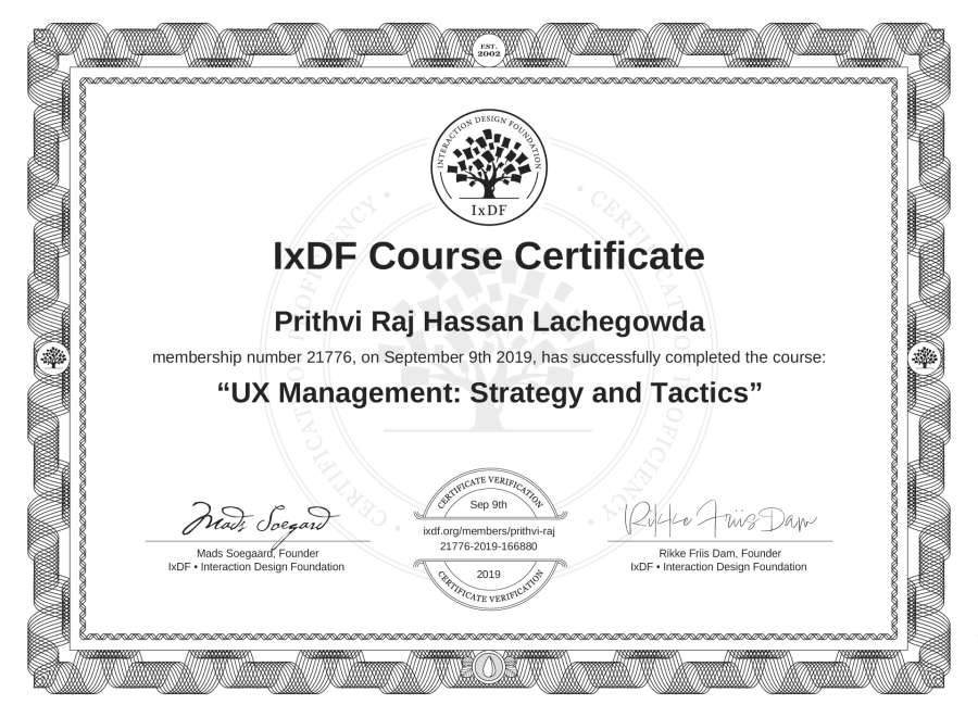 Prithvi Raj Hassan Lachegowda's IxDF Course Certificate: UX Management: Strategy and Tactics