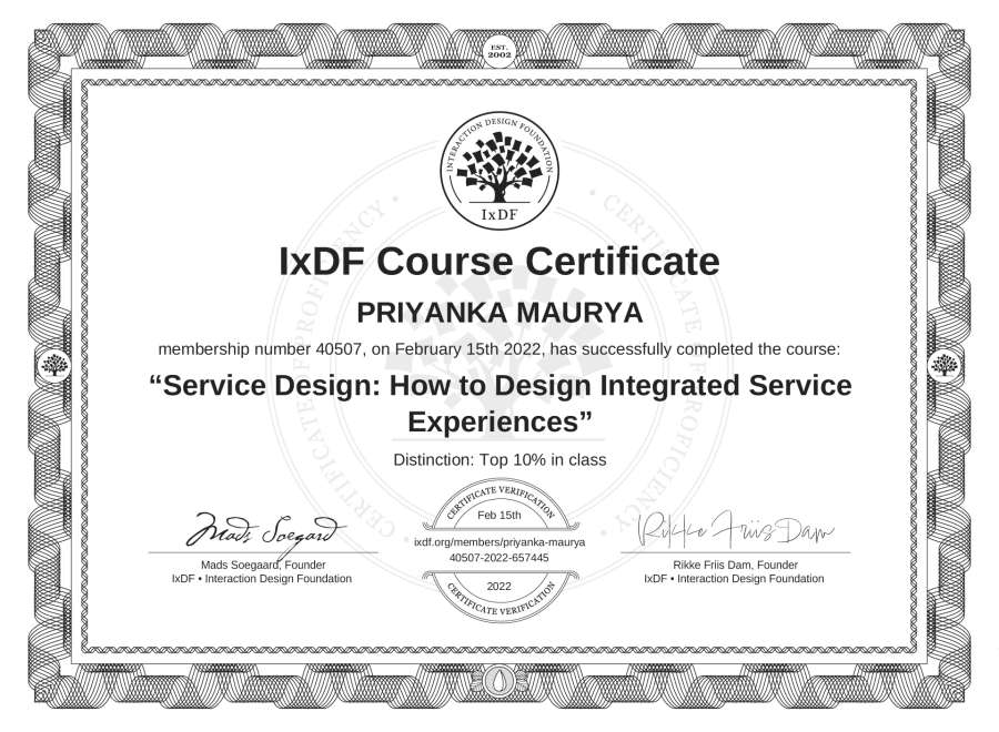 PRIYANKA MAURYA's IxDF Course Certificate: Service Design: How to Design Integrated Service Experiences