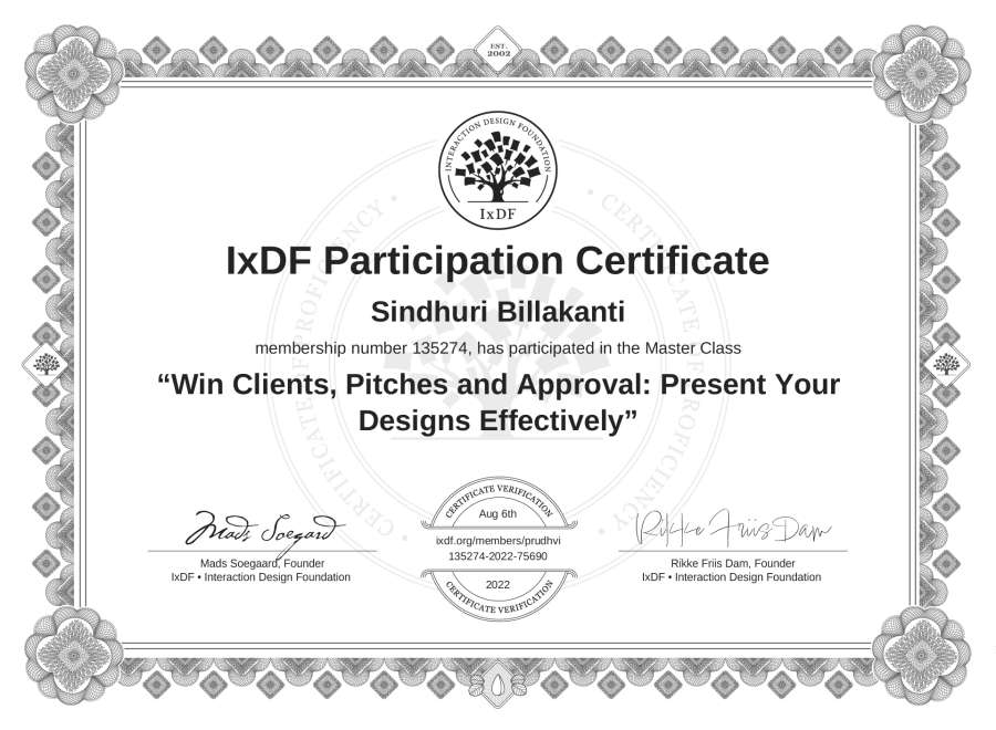 Sindhuri Billakanti's IxDF Masterclass Certificate: Win Clients, Pitches and Approval: Present Your Designs Effectively