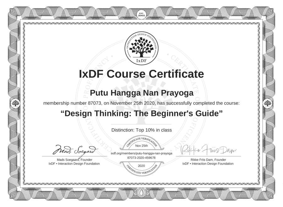 The IxDF Course Certificate above is awarded to Putu Hangga Nan Prayoga with a Top 10% Distinction in formal recognition of their coursework surpassing the rigorous benchmarks of exceptional performance established by the IxDF Educational Codex.