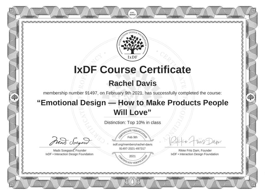 Rachel Davis's IxDF Course Certificate: Emotional Design — How to Make Products People Will Love