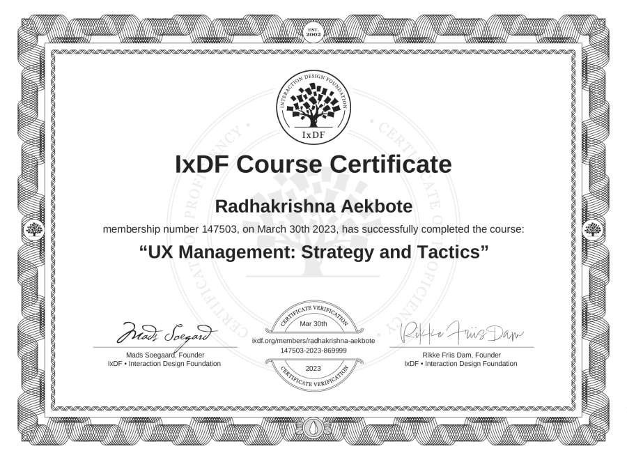 Radhakrishna Aekbote's IxDF Course Certificate: UX Management: Strategy and Tactics