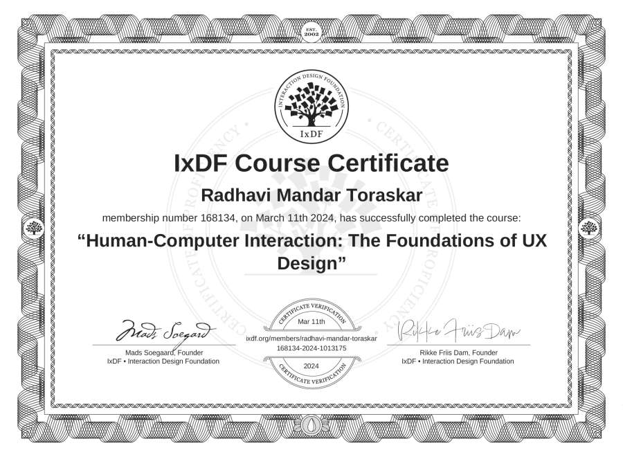 Radhavi Mandar Toraskar's IxDF Course Certificate: Human-Computer Interaction: The Foundations of UX Design