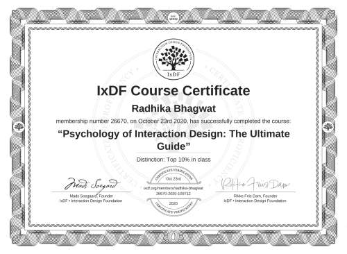 IxDF Course Certificates are awarded to Radhika Bhagwat in formal recognition of their coursework surpassing the rigorous benchmarks of exceptional performance established by the IxDF Educational Codex.