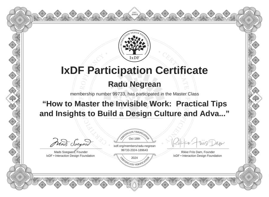 Radu Negrean's IxDF Masterclass Certificate: How to Master the Invisible Work: Practical Tips and Insights to Build a Design Culture and Advance Your Career