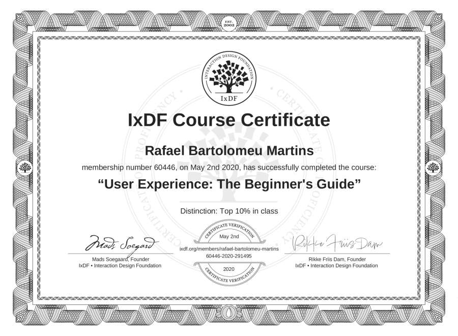 The IxDF Course Certificate above is awarded to Rafael Bartolomeu Martins with a Top 10% Distinction in formal recognition of their coursework surpassing the rigorous benchmarks of exceptional performance established by the IxDF Educational Codex.