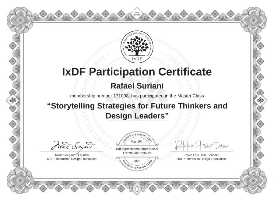 Rafael Suriani's IxDF Masterclass Certificate: Storytelling Strategies for Future Thinkers and Design Leaders