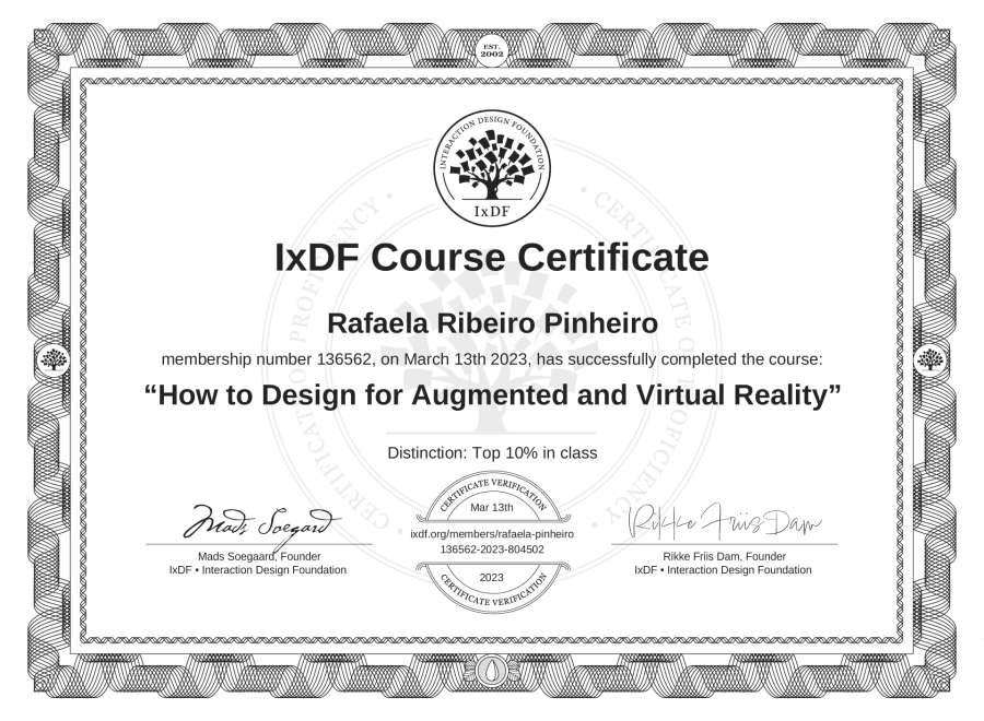 Rafaela Ribeiro Pinheiro's IxDF Course Certificate: How to Design for Augmented and Virtual Reality