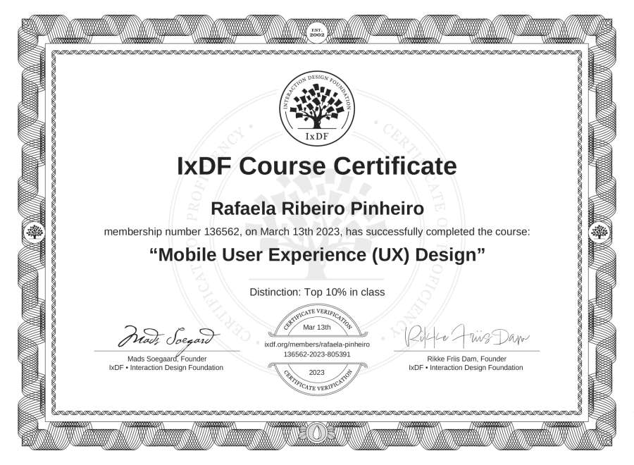 The IxDF Course Certificate above is awarded to Rafaela Ribeiro Pinheiro with a Top 10% Distinction in formal recognition of their coursework surpassing the rigorous benchmarks of exceptional performance established by the IxDF Educational Codex.