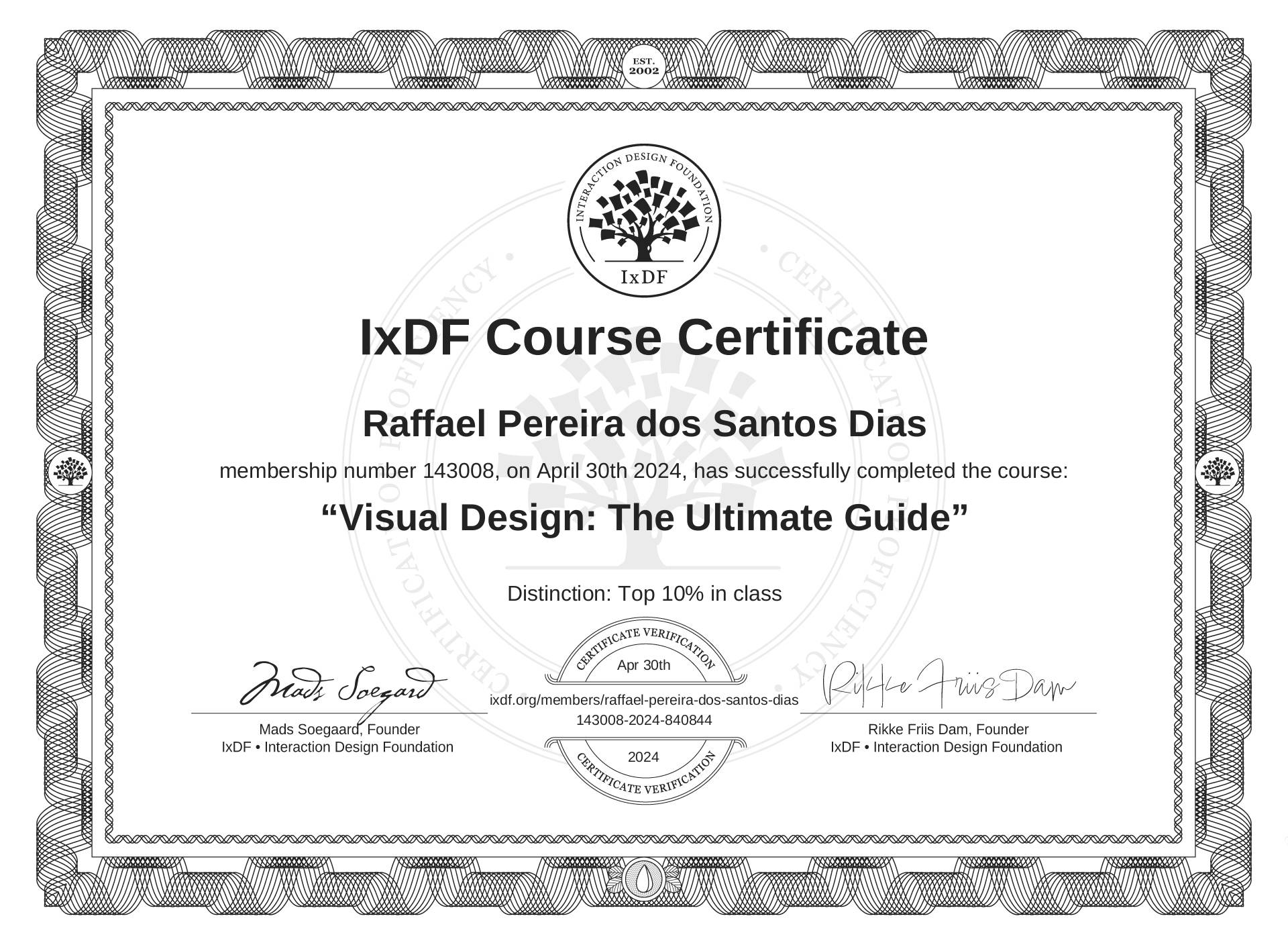 The IxDF Course Certificate above is awarded to Raffael Pereira dos Santos Dias with a Top 10% Distinction in formal recognition of their coursework surpassing the rigorous benchmarks of exceptional performance established by the IxDF Educational Codex.