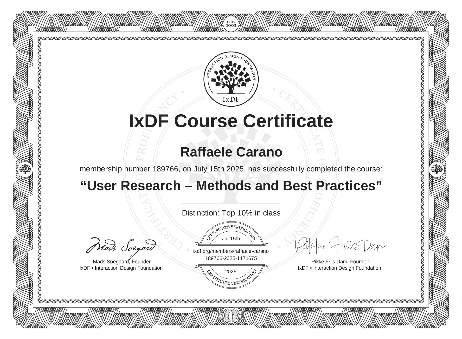 The IxDF Course Certificate above is awarded to Raffaele Carano with a Top 10% Distinction in formal recognition of their coursework surpassing the rigorous benchmarks of exceptional performance established by the IxDF Educational Codex.