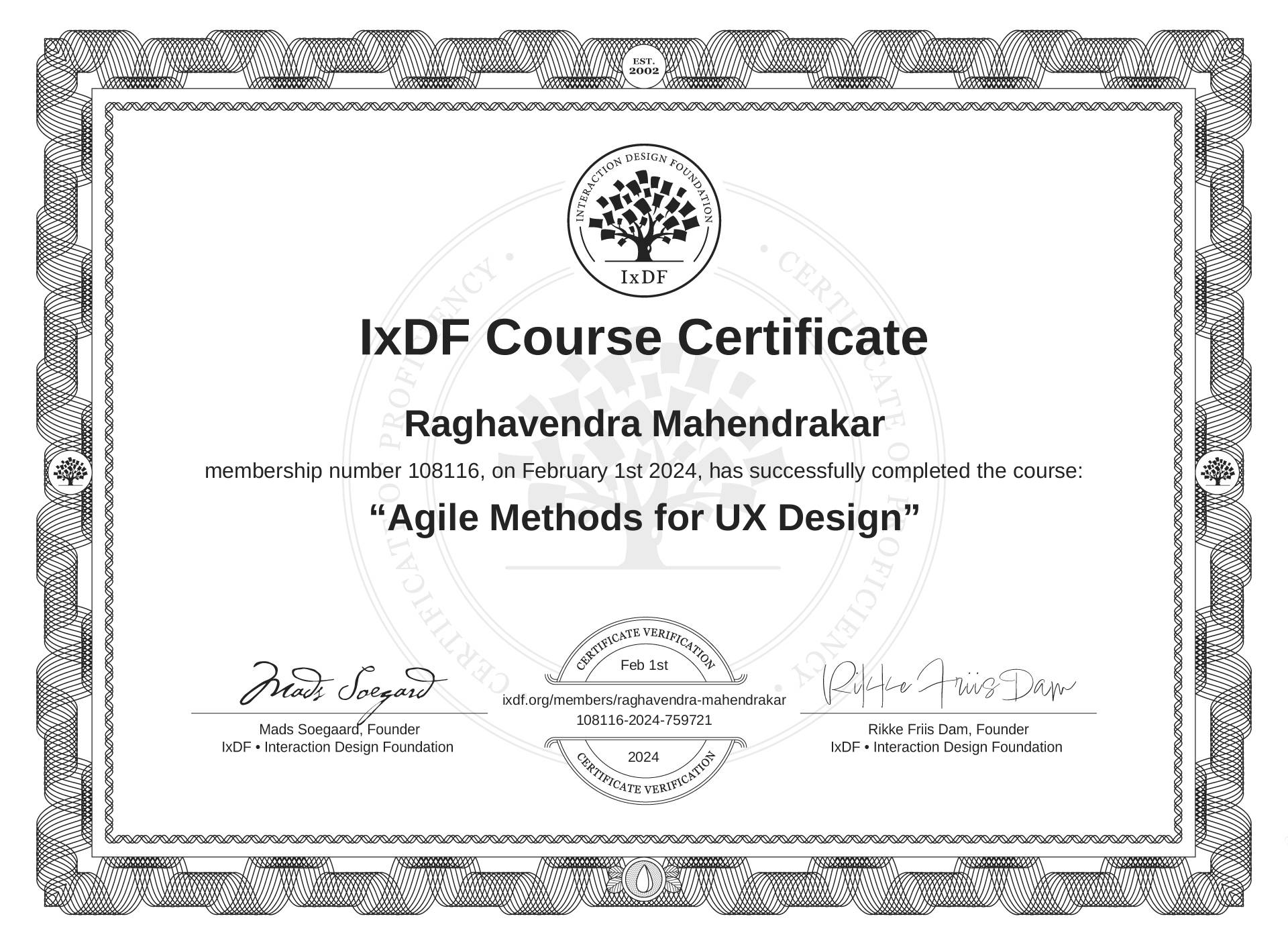 The IxDF Course Certificate above is awarded to Raghavendra Mahendrakar in formal recognition of their coursework surpassing the rigorous benchmarks of exceptional performance established by the IxDF Educational Codex.