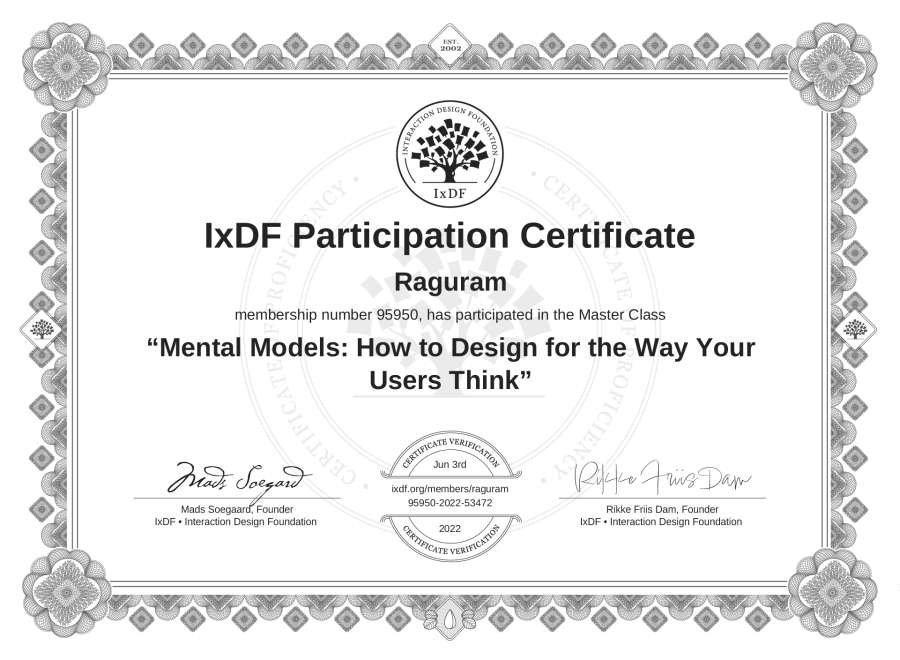 Raguram's IxDF Masterclass Certificate: Mental Models: How to Design for the Way Your Users Think