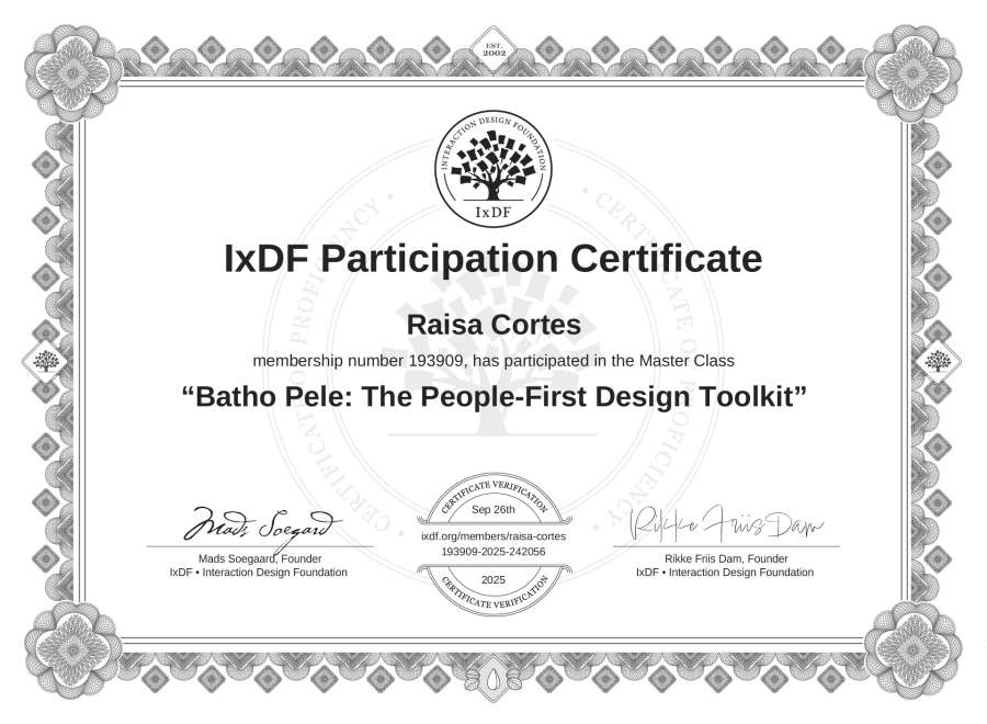 Raisa Cortés's IxDF Masterclass Certificate: Batho Pele: The People-First Design Toolkit