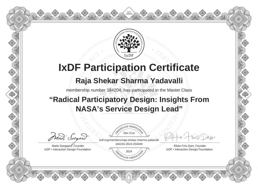 Raja Shekar Sharma Yadavalli's IxDF Masterclass Certificate: Radical Participatory Design: Insights From NASA’s Service Design Lead